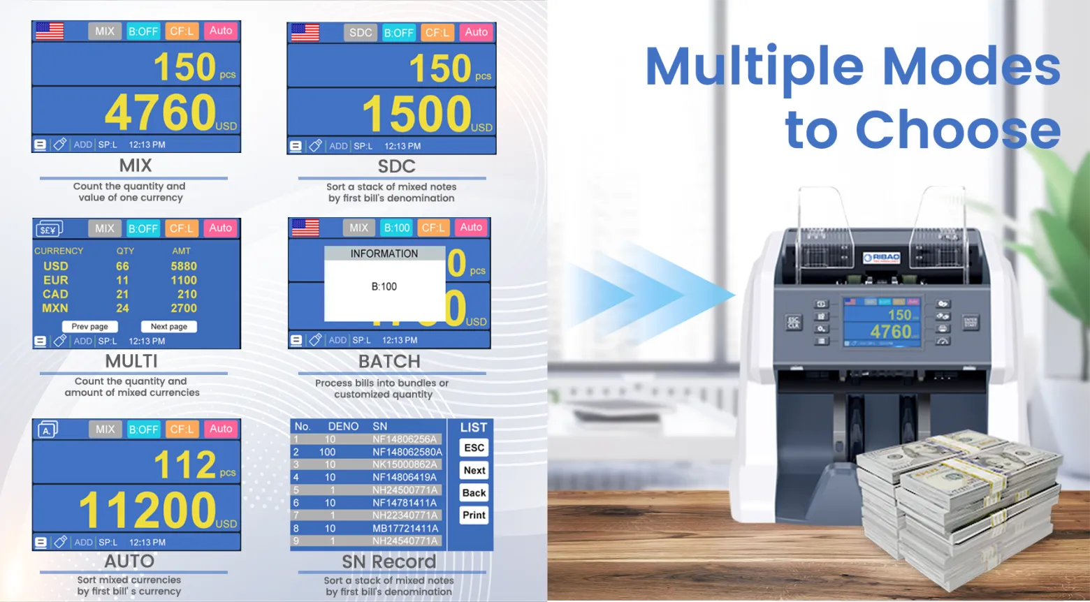 Robuste, fiable et simple à entretenir, la Ribao BC-50 est un outil indispensable pour toute structure manipulant d’importants volumes de liquidités.